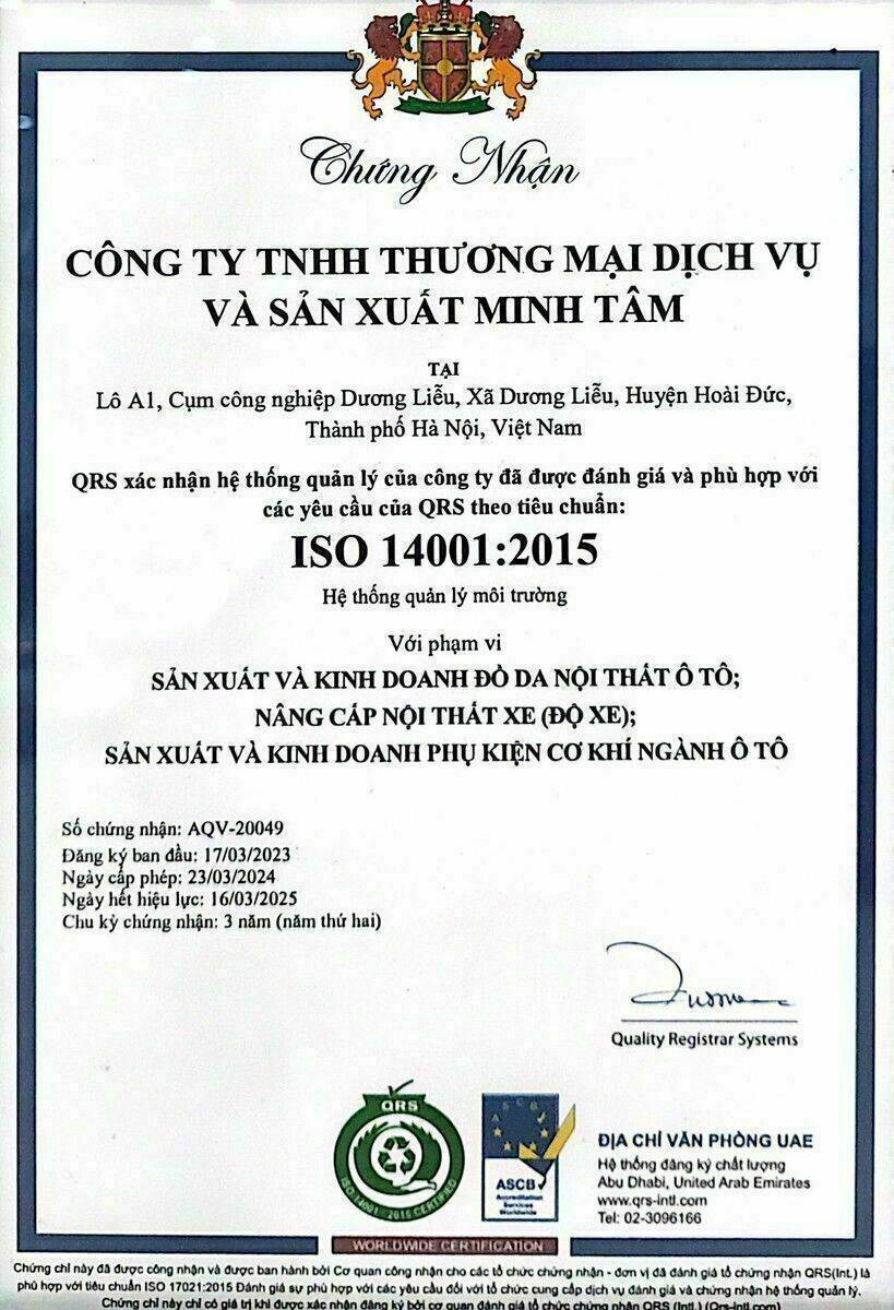 Chúng tôi vui mừng thông báo rằng Công ty TNHH Thương Mại Dịch Vụ và Sản Xuất Minh Tâm đã chính thức nhận được hai chứng nhận quan trọng: ISO 9001:2015 và ISO 14001:2015. Đây là một cột mốc đáng tự hào, khẳng định cam kết của chúng tôi trong việc cung cấp các sản phẩm và dịch vụ chất lượng cao, đồng thời duy trì và bảo vệ môi trường.