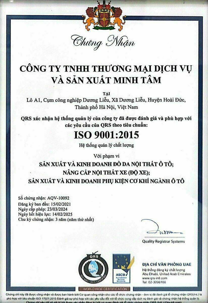 Chứng nhận ISO 9001:2015 khẳng định rằng Minh Tâm luôn đặt chất lượng lên hàng đầu trong mọi hoạt động. Chúng tôi áp dụng tư duy dựa trên rủi ro để nhận diện và quản lý các rủi ro cũng như cơ hội, từ đó nâng cao hiệu suất và hiệu quả của toàn bộ tổ chức. Việc này không chỉ giúp chúng tôi đáp ứng các yêu cầu của khách hàng mà còn tăng cường sự hài lòng và tin tưởng của họ đối với thương hiệu Minh Tâm.